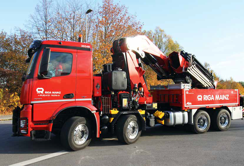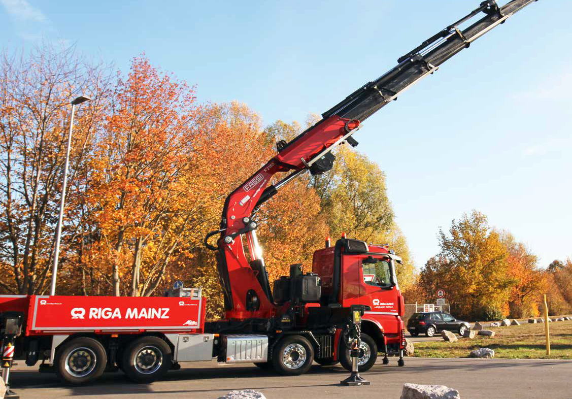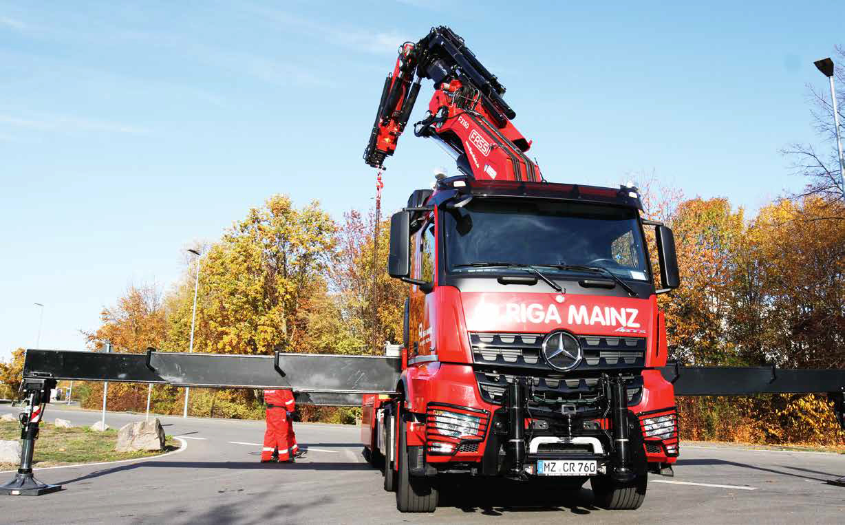 Zusammen mit seinem fahrbaren Untersatz, einem Arocs-3751-Vierachser, steht der F2150 seit 15 Monaten in den Diensten von Riga Mainz. Das 1929 gegründete Unternehmen zählt im Raum Mainz, Frankfurt und Ludwigshafen zu den Schwergewichten, wenn es um Aufträge in den Bereichen Heben, Bewegen und Transportieren geht. Egal, ob es dabei hoch hinauf oder um mehrere hundert Tonnen schwere Lasten geht – Riga übernimmt selbst anspruchsvollste Jobs sowohl bei Infrastruktur- als auch bei industriellen Großprojekten. Der gigantische Fassi-Kran bildet mit dem Arocs bei Riga ein Team mit eng abgestecktem Einsatzspektrum: Das Kranunternehmen hat das Fahrzeug ausschließlich für Einsätze auf dem Standort der BASF in Ludwigshafen abgestellt. Auf dem riesigen Werksgelände, dem größten zusammenhängenden Chemieareal der Welt, müssen regelmäßig Kessel, Reaktoren, Motoren oder Getriebe der umfangreichen Anlagen ausgetauscht oder auch völlig neue Produktionslinien eingerichtet werden. „Bei der BASF“, resümiert Söhnge, „hat sich das Fahrzeug binnen kürzester Zeit als zukunftsträchtige Investition erwiesen. Der Kran ist praktisch jeden Tag im Einsatz.“ Heraus aus dem Werksgelände kommt der Truck allerdings nur, wenn er zur Erledigung von Wartungsarbeiten zurück zum Fahrzeugbauer muss. Zu sehen bekommt man das Schwergewicht also nur höchst selten.