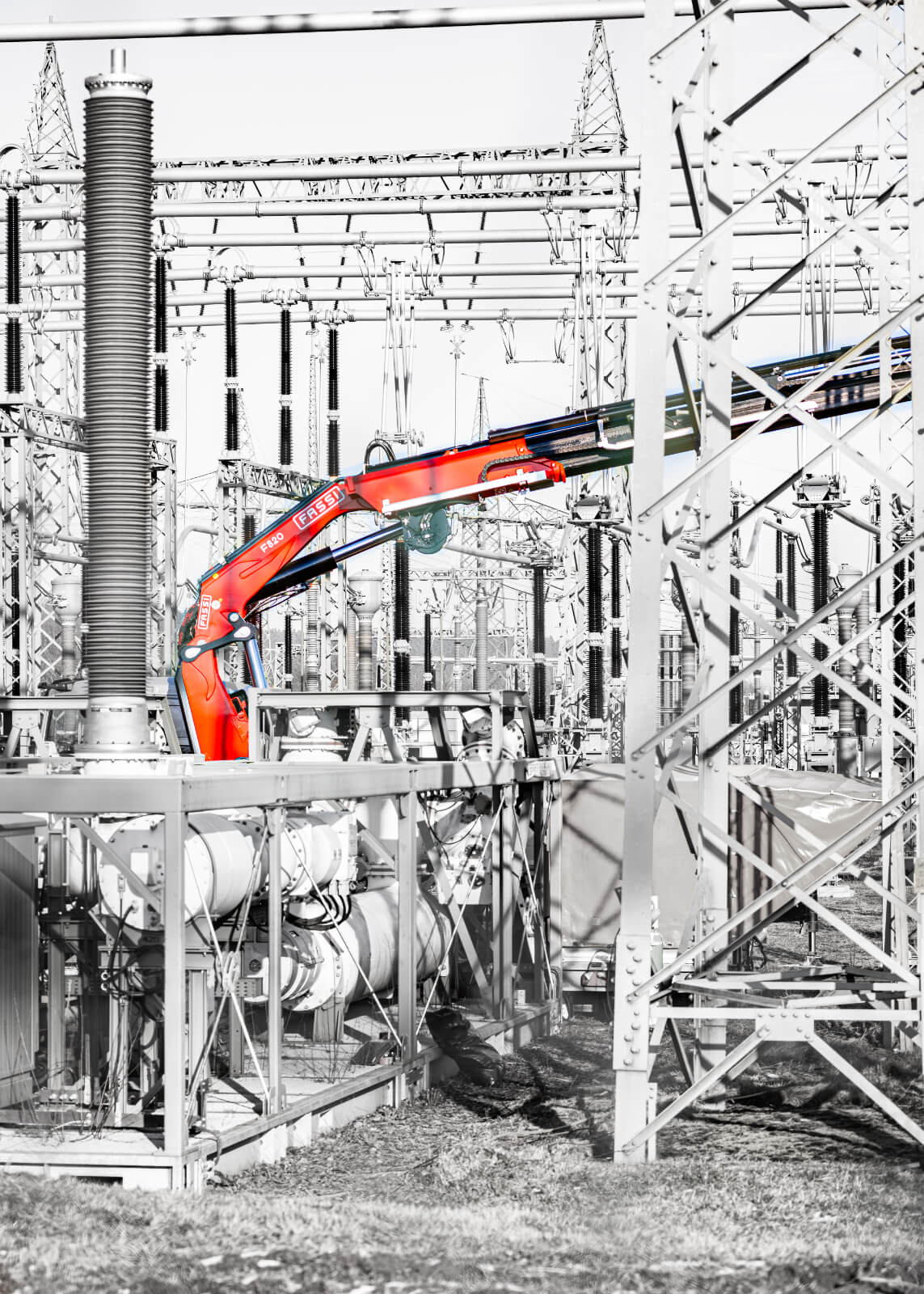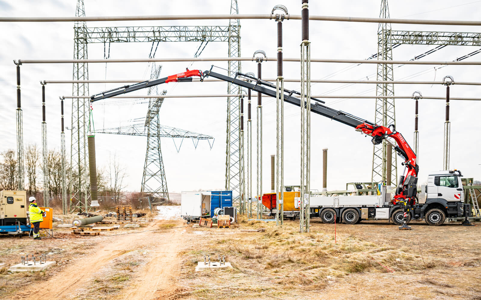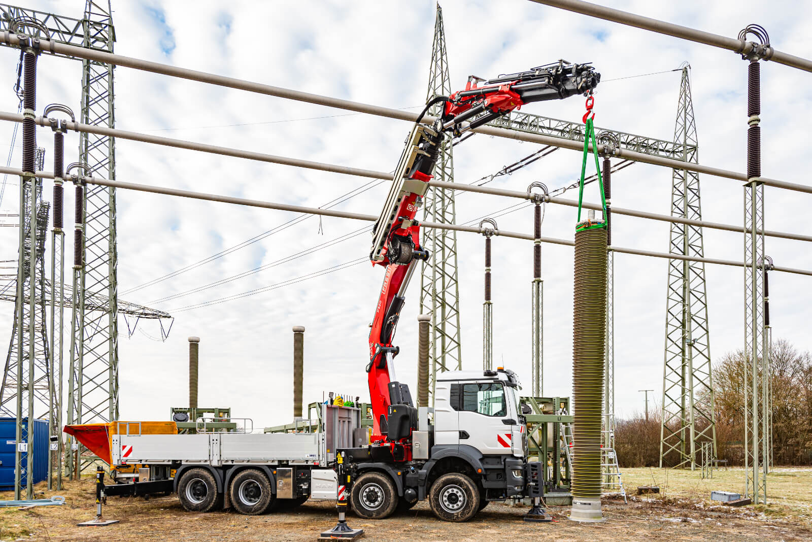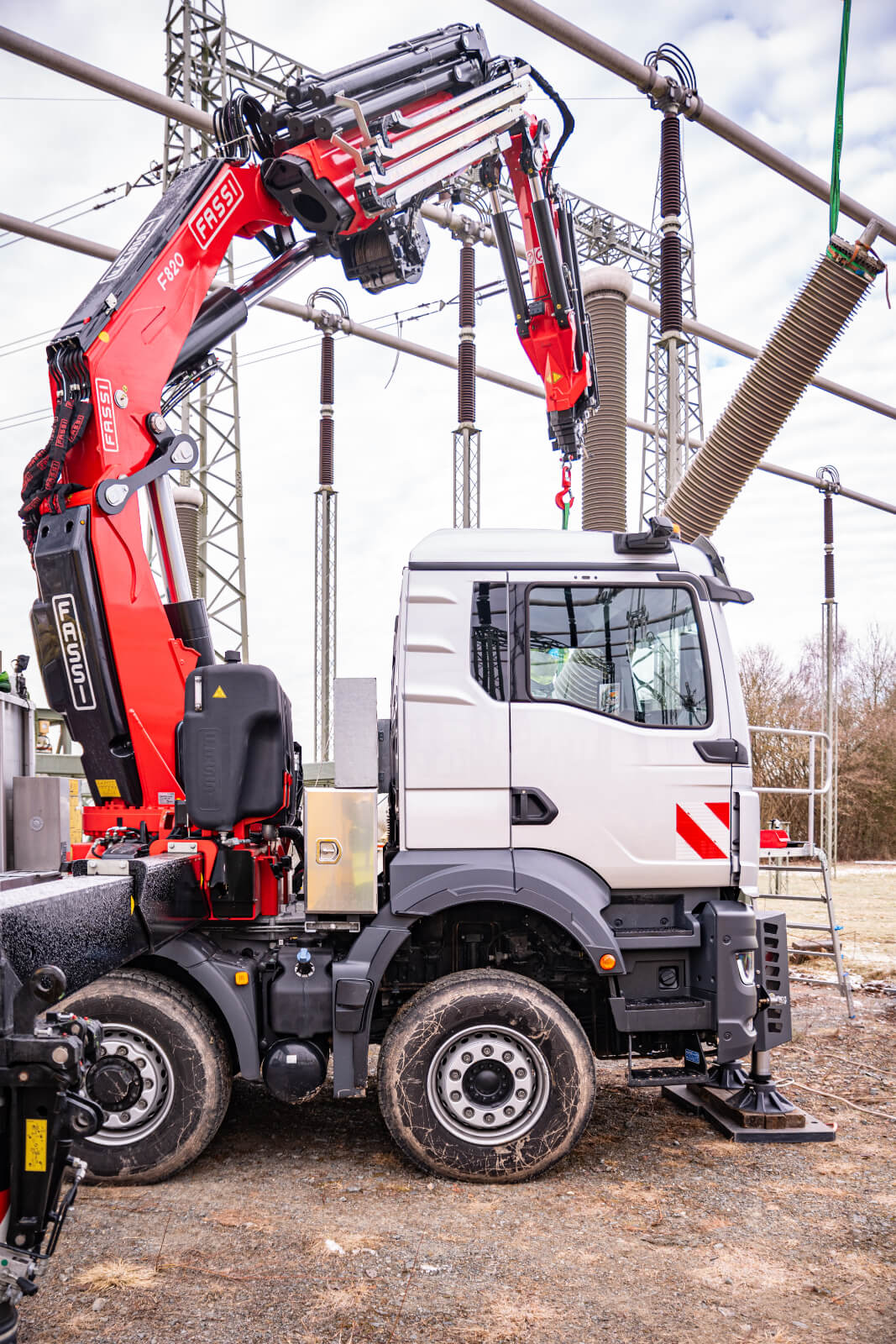 Mit einem Hubmoment von 80 tm / 785 kNm und einer maximalen hydraulischen Ausladung bis 26,50 m – durch ein zusätzliches Knickarmsystem (Jib) – kann der FASSI-Ladekran anspruchsvolle Hebeaufgaben erfüllen. Ein bemerkenswerter Einsatz dieses Kranes unterstützte das TenneT-Team bei der Demontage eines mobilen 380-kV Schaltfeldes, um dieses transportfähig zu machen. Danach wurde es in ein anderes Umspannwerk transportiert und kommt dort wieder zum Einsatz.