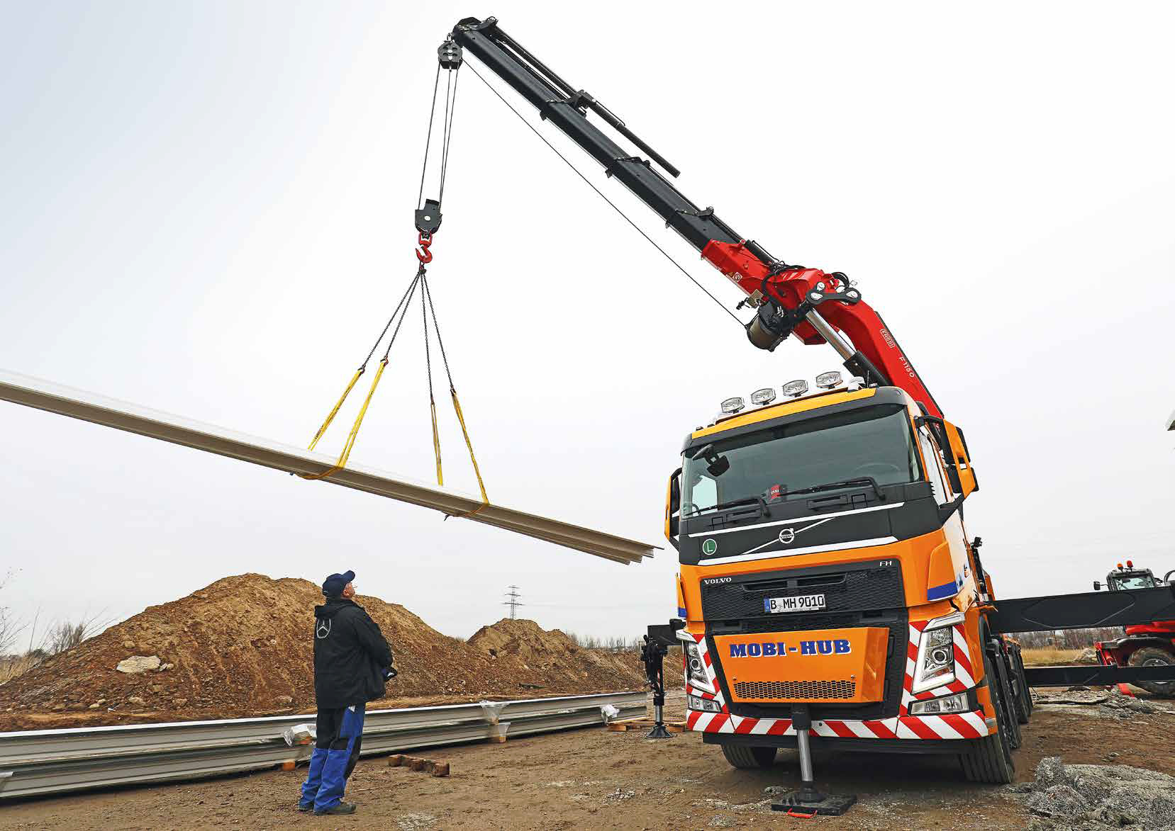 Offensichtlich also kein Grund, darüber nachzudenken. Vielmehr beschäftigten ihn da schon die ganzen neuen Features, die der auf dem FH 540 montierte F1150- Kran biete, den sein Arbeitgeber jüngst als Ersatz für ein vor kurzem abgestoßenes Fahrzeug mit demletztlich nicht überzeugenden Kran eines Fassi-Mitbewerbers angeschafft hatte. „Der Kran hat sogar eine Automatik für das Ausfalten des Krans, da brauchst du Hubarm und Knickarm nicht mehr einzeln ansteuern. Und er zeigt dir auf dem Display auch, in welche Richtung du welche Hubleistung abrufen kannst. Man sieht genau, da hinten die rechte Stütze habe ich nicht voll ausgefahren, weil sie der Hauptarbeitsseite gegenüberliegt. Hier komme ich nur auf 80 Prozent.“ Verglichen mit den enormen Hubleistungen der schweren Fahrzeugkrane von Mobi-Hub, wirkt der auf dem Vierachser montierte Fassi F1150 eher wie ein Hilfskran. Und genau das ist letztlich auch seine Hauptaufgabe: Wie sein Vorgänger soll er in erster Linie beim Aufbau der Leistungsträger des Unternehmens assistieren, wenn diese einmal mehr irgendwelche Brücken oder Teile von Windkraftanlagen an ihren Bestimmungsort hieven. Was natürlich nicht ausschließt, sich auch einzig des F1150 zu bedienen, wenn, wie heute auf dem Cleantech Business Park, keine gigantischen Hubleistungen gefordert sind.