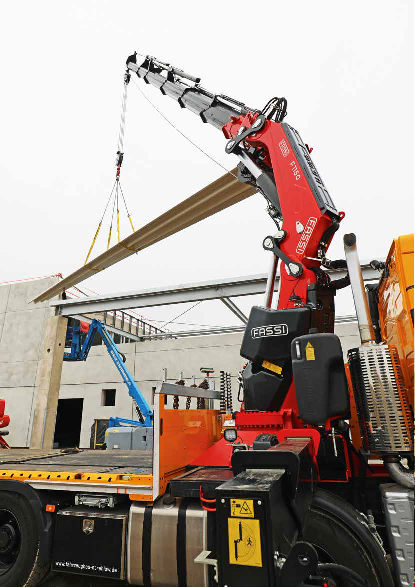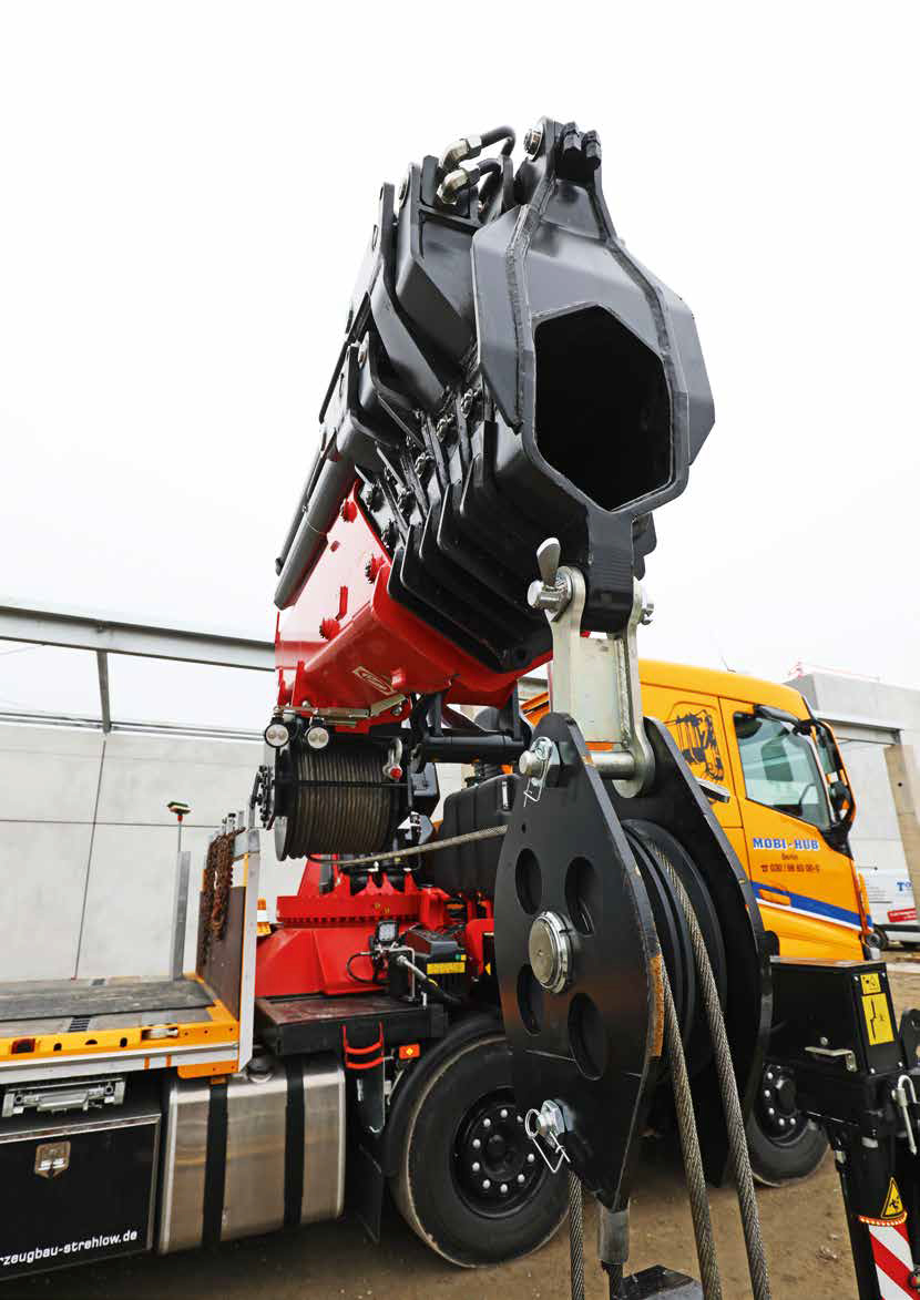 Doch zurzeit ist an diesem abseitigen Bereich der Baustelle keine Aktivität zu verzeichnen. Beste Gelegenheit also, das Kranfahrzeug genauer zu inspizieren. Die Ladefläche des Vierachsers mit dem Fassi-Kran baut ausgesprochen niedrig und verfügt daher hintenüber eine tief liegende Abstützung. Eine unterhalb des Kühlergrills angeordnete, voluminöse Abdeckung beherbergt zudem eine per Hilfsrahmen nach vorne geführte fünfte Abstützung. Das wie der Rahmen des Aufbaus orange-gelb lackierte Fahrerhaus gibt zudem Aufschluss, mit wem man es hier zu tun hat: Mobi-Hub steht da in blauen Lettern, daneben eine Zeichnung von der Front eines schweren Mobilkrans. Mobi-Hub, das sei an dieser Stelle nachgereicht, ist ein kurz nach der Wende 1994 gegründeter Krandienstleister, der im Großraum Berlin seit Jahren eine echte Instanz darstellt. Das Unternehmen betreibt eine ganze Flotte von Mobilkranen, deren Leistungsspektrum bis zu einer Tragkraft von 1000 Tonnen reicht. Daneben zählen zahlreiche Lkw mit Ladekran und etliche Schwerlastzüge zum Einsatzbestand. Auf die Zugehörigkeit zu einem Kranunternehmen indes dürfte auch ein nicht unbedingt alltägliches Detail des F1150-Ladekrans zurückzuführen sein: Sein Knickarm verfügt über eine Winde und am letzten Ausschub ist statt eines festen Hakens eine vierfach gescherte Flasche montiert. Damit büßt der Kran eine der Stärken moderner Ladekrane – die starre Führung des Hakens – ein, kann auf der anderen Seite hinsichtlich seiner Vielseitigkeit allerdings auch eindeutige Vorteile verbuchen. „Was willst du denn machen, wenn es gilt, etwas hinter einem Hindernis aufzunehmen oder abzusetzen?“, antwortet Fließ auf die Frage, warum sich seine Firma für eine Ausführung mit Winde entschieden habe.
