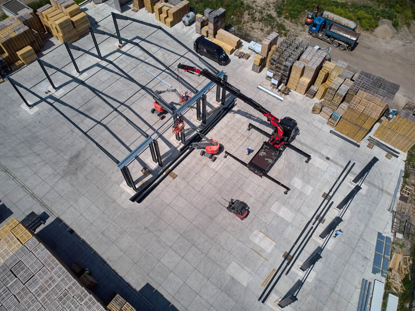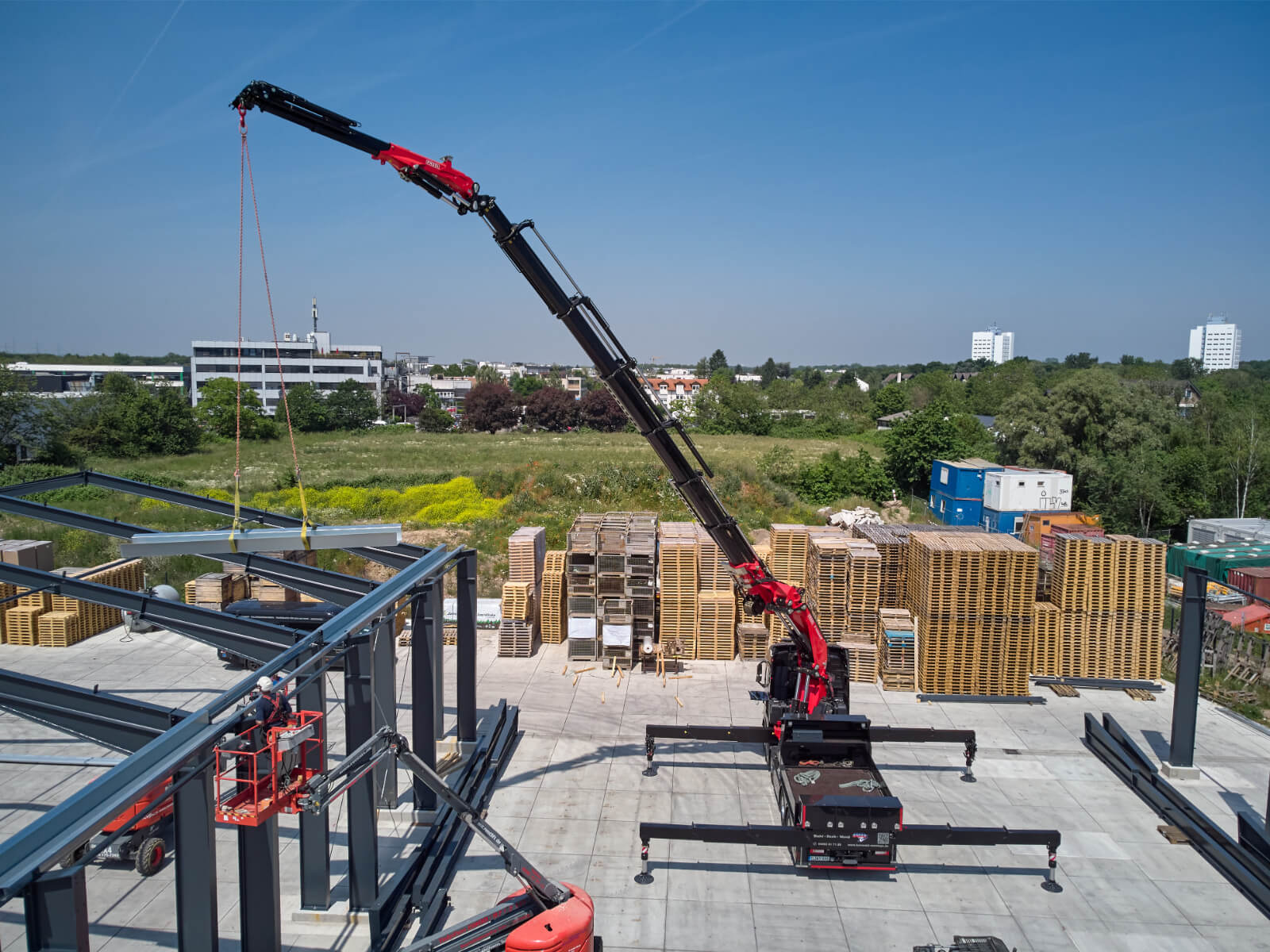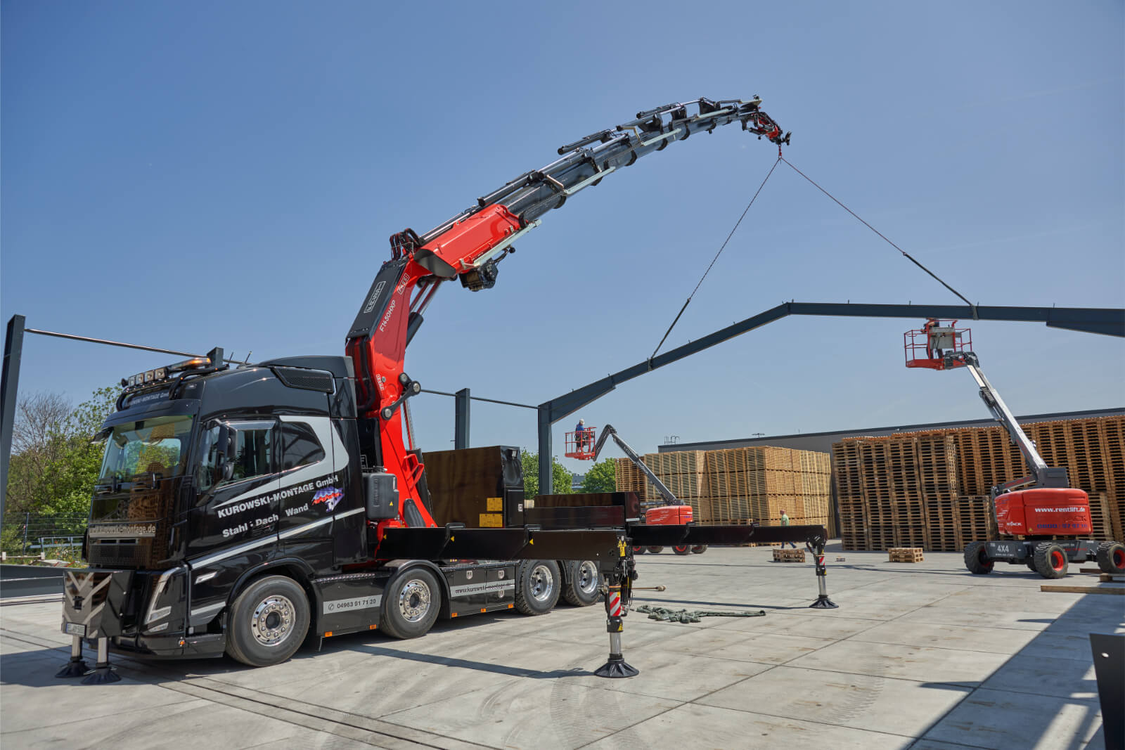 A + T Fahrzeugbau stattete den Volvo mit einer doppelten Frontabstützung inklusive einer Rahmenverstärkung aus. Das ermöglicht so vorne eine maximale Abstützlast von 2 x 18 Tonnen. Damit ist auch bei Arbeiten über der Fahrerkabine mehr als 80 % der maximalen Hubkraft des Kranes verfügbar. Für Jacek Kurowski ist das ein dickes Plus. Beim Bau einer Halle in Köln Hürth beispielsweise konnten so alle je rund 4,5 t wiegenden Dachträger verbaut werden, ohne dass der Lkw umgesetzt werden