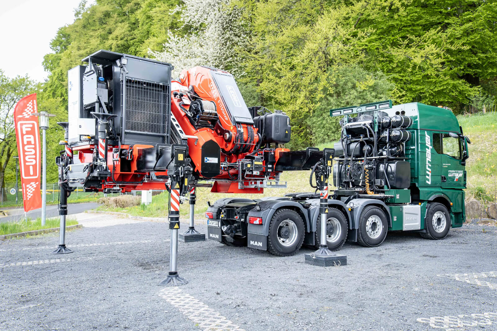 Mit einem FASSI F1750 der Techno-Baureihe hat die Firma W. Mayer Schwertransport und Kranarbeiten eine hochspezielle Kranlösung im Einsatz. Arno Alt, der Geschäftsführer, hat zusammen mit dem Know-how des Fahrzeugbauers ISM Industrieservice Müller seine innovative Idee umgesetzt. Der Kran kann über ein Powerpack, das wahlweise durch einen Diesel- oder Elektromotor angetrieben wird, unabhängig vom Trägerfahrzeug, einer speziellen 4Achs-Schwerlastmaschine, arbeiten. Der FASSI F1750 inklusive 6fach Abstützung