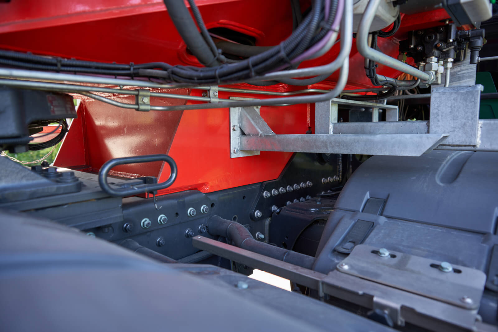 und Powerpack sind auf einem Tragrahmen montiert und mit dem LKW hydraulisch verbolzt, so dass die Kraneinheit bei Bedarf abnehmbar ist. Dies ermöglicht sowohl stationäre Montagen als auch Einsätze auf einem SPMT oder einem Raupenfahrgestell.