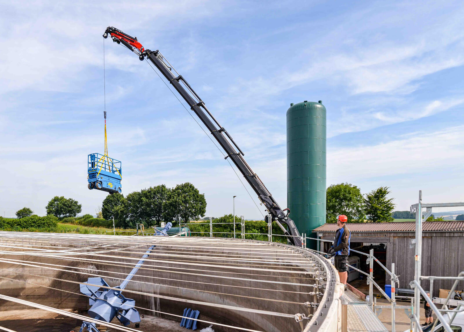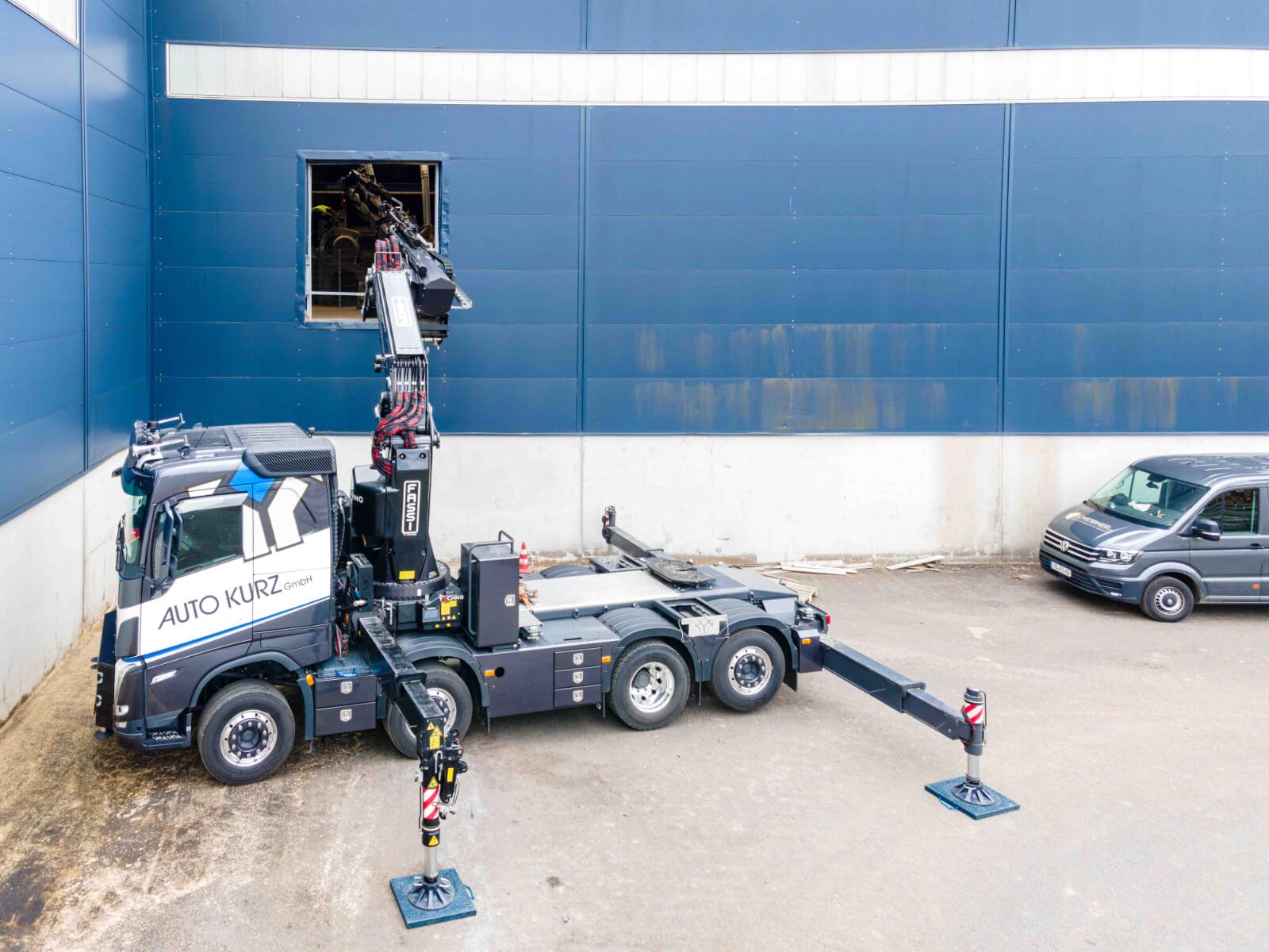 Zum Fahrzeugpark von Auto Kurz gehört auch der F1250R-HXP, der neueste Vertreter der TECHNO Baureihe, der auf ein Volvo–Fahrgestell aufgebaut ist. Der Geschäftsführer beschreibt die zahlreichen Einsatzmöglichkeiten des Ladekranes. So war kürzlich das Kranzfahrzeug in einem Sägewerk im Einsatz. Dort stand die Wartung der Anlage an, dafür musste der sogenannte Holzausrücker demontiert werden. Mit Hilfe des FASSI Kranes war das für den Fahrer kein Problem. Das galt ebenfalls für die Anlagenrevision in einer Bio-gasanlage. Dort bestand die Aufgabe Paddelrührwerke auszutauschen. Danach wurde mit Hilfe des Ladekranes ein Netz angebracht, das in weiterer Folge zur Montage der Haube für die Biogasanlage dient. Wie Auto Kurz Geschäftsführer Daume informierte, erfolgten die Arbeiten auch bei diesem Einsatz des F1250R-HXP problemlos. Er lobte die FASSI-Technik, die sich durch ihre Vielseitigkeit und Leistungsstärke auszeichnet. So werden unter anderem die Krane für die verschiedensten Arbeiten auf Dächern eingesetzt. Dabei geht es meist darum, die unterschiedlichsten Baustoffe auf die Dächer oder Türme zu bringen und damit die Arbeit der Dachdecker und Zimmerer erheblich zu erleichtern. Das seien typische Einsätze, die in der Region rund um Willingshausen öfters erfolgen, so Daume. Gleiches gelte ebenfalls für Baustellen, auf denen Betonfertigteile verarbeitet werden. Auch hierbei habe ein Ladekran gegenüber einem Autokran viele Vorteile, die er ausspielen könne. Er benötige weniger Platz beim Entladen als ein Mobilkran.