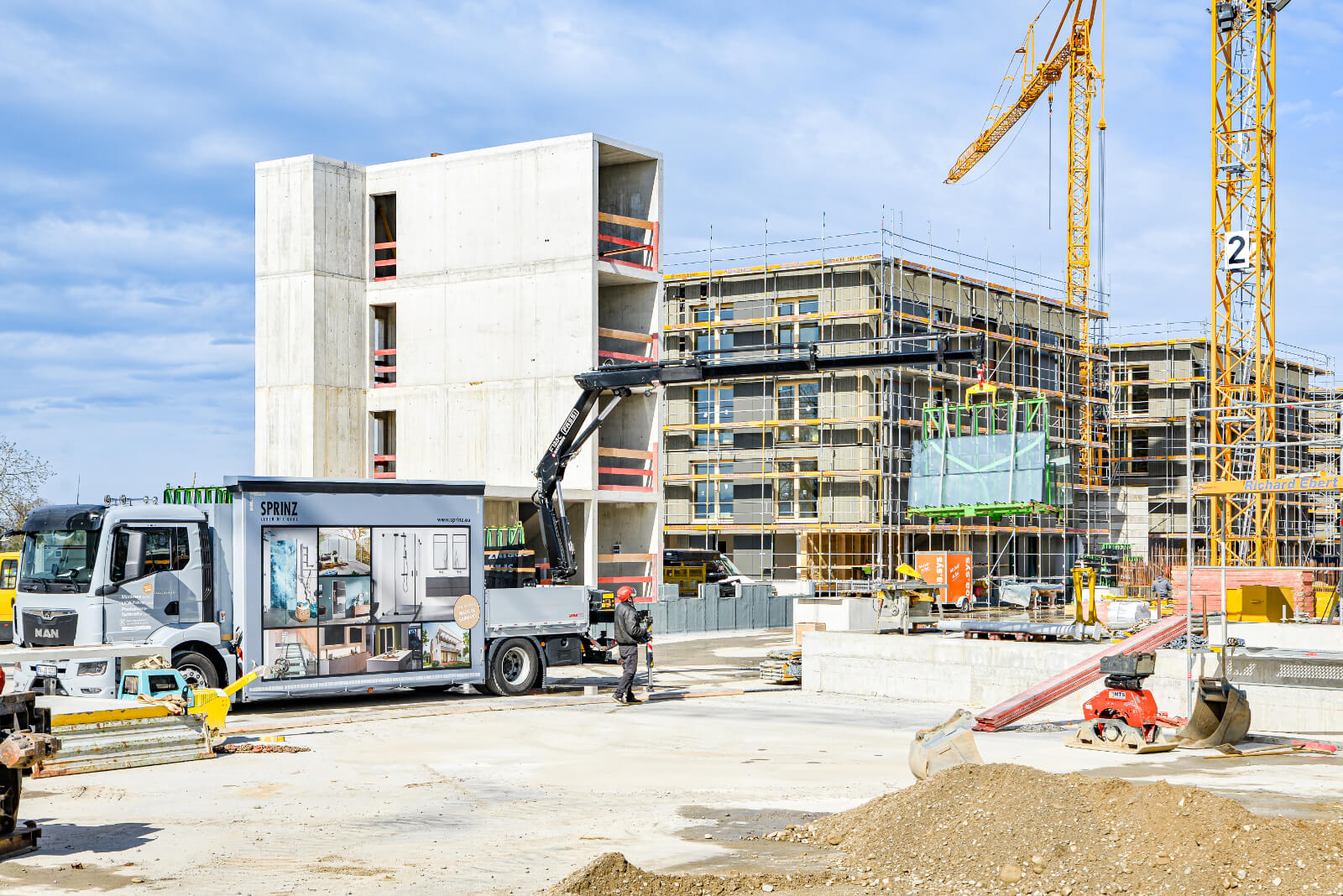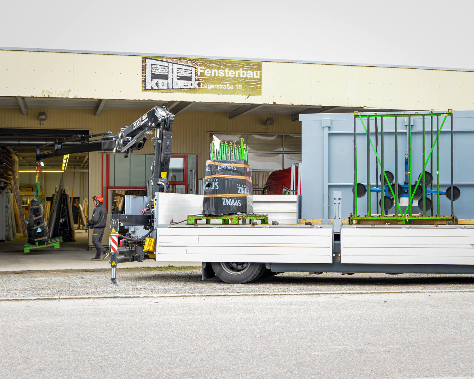 Damit das sensible Transportgut Glas möglichst sicher beim Kunden ankommt, sind die Anforderungen an Fahrzeug und Bedienpersonal hoch. So werden die Sprinz- Fahrzeuge immer besser ausgestattet, um die Arbeit noch effizienter und sicherer in der Anwendung zu machen. Die neueste Investition im Fuhrpark stellt ein MAN TGS 18.400 4×2 mit einem heckmontierten FASSI-Kran F125AC dar, geliefert von der Natterer GmbH & Co. KG in Leutkirch. Der spezifische Pritschen-Aufbau für Glastransporte wurde von der Gomm Fahrzeugbau GmbH in Kißlegg gefertigt.
