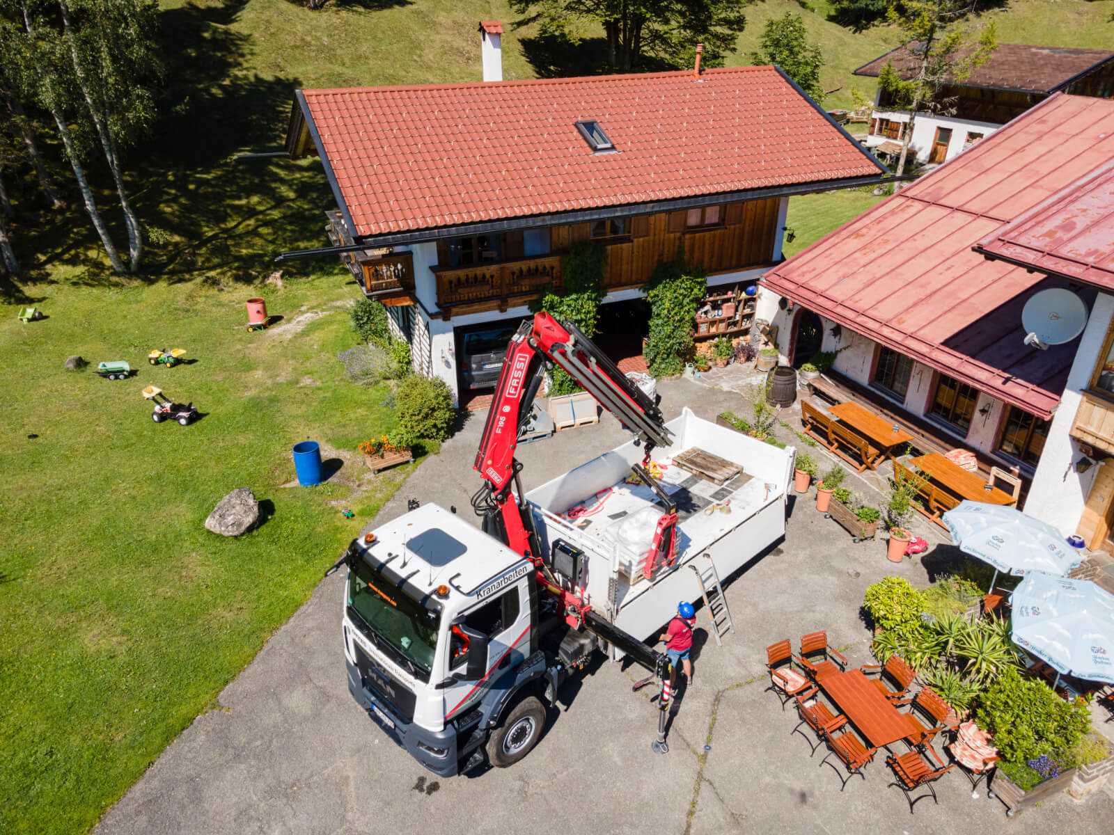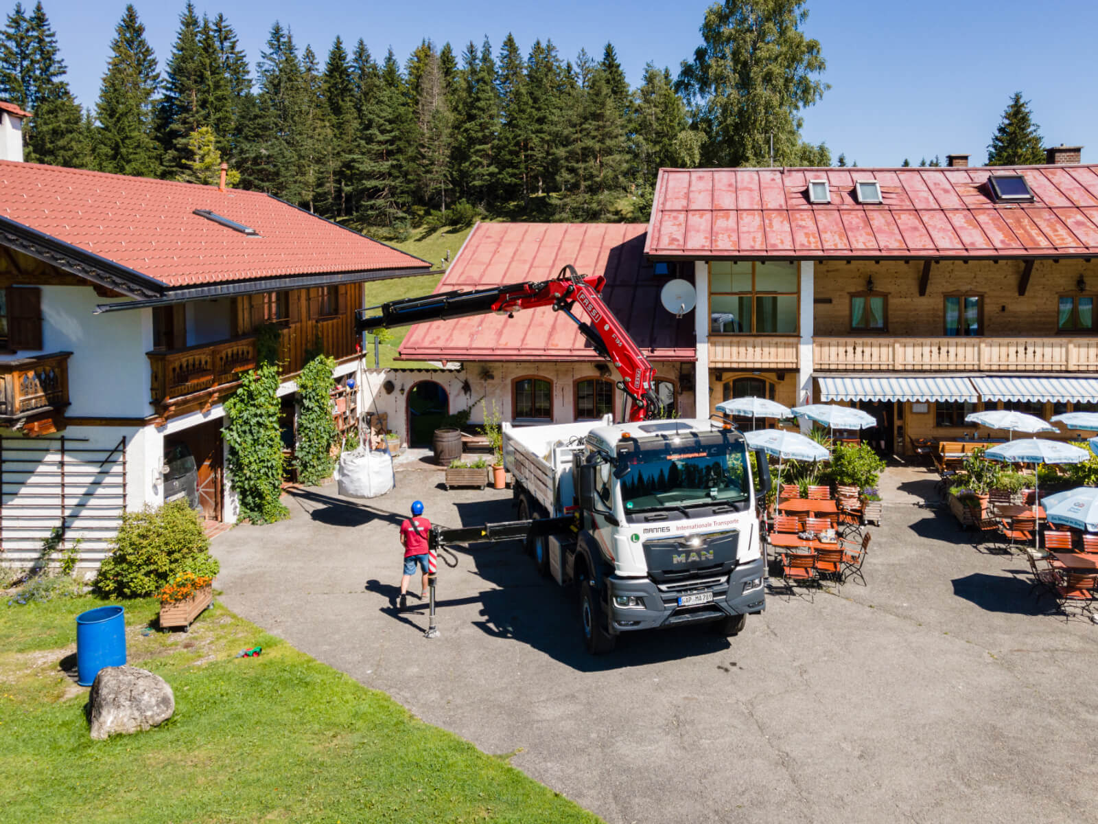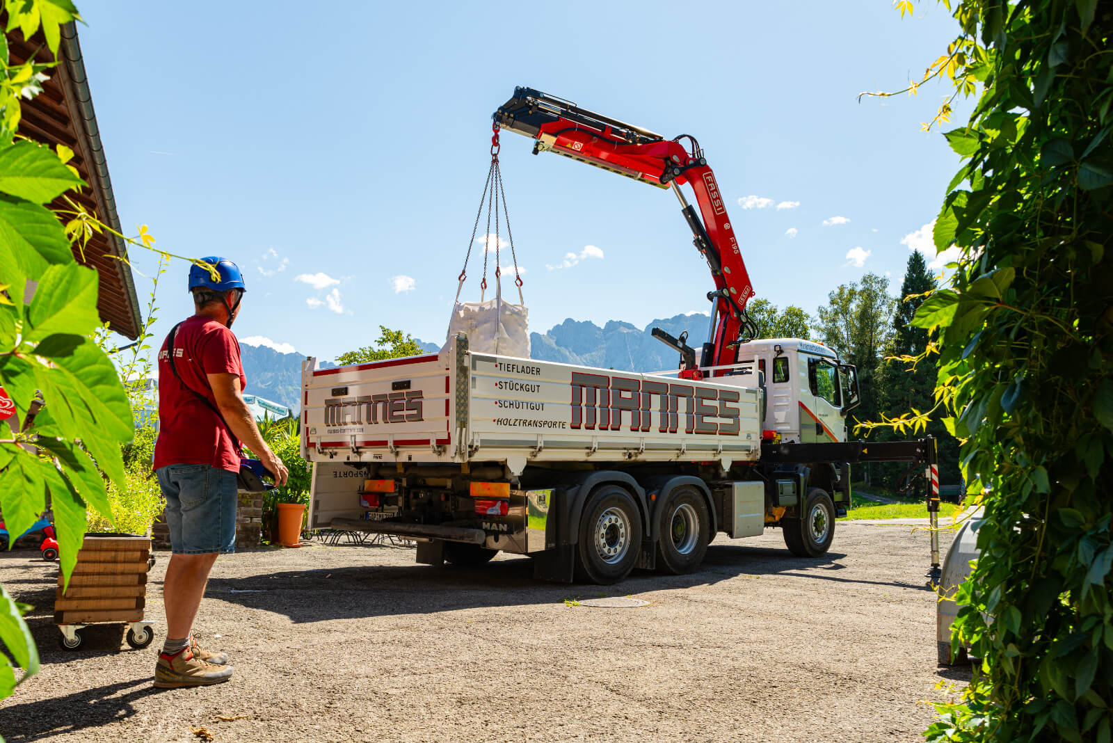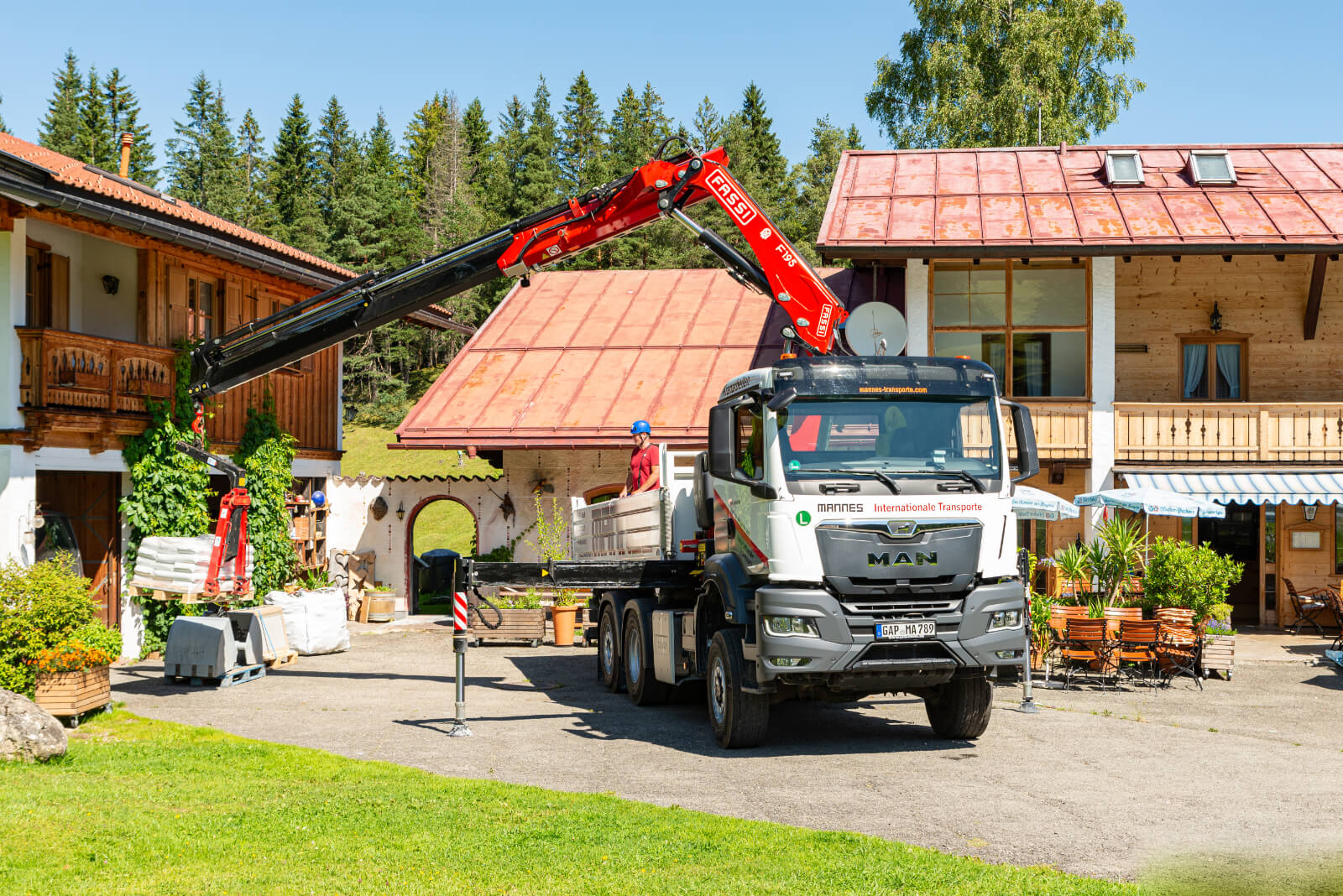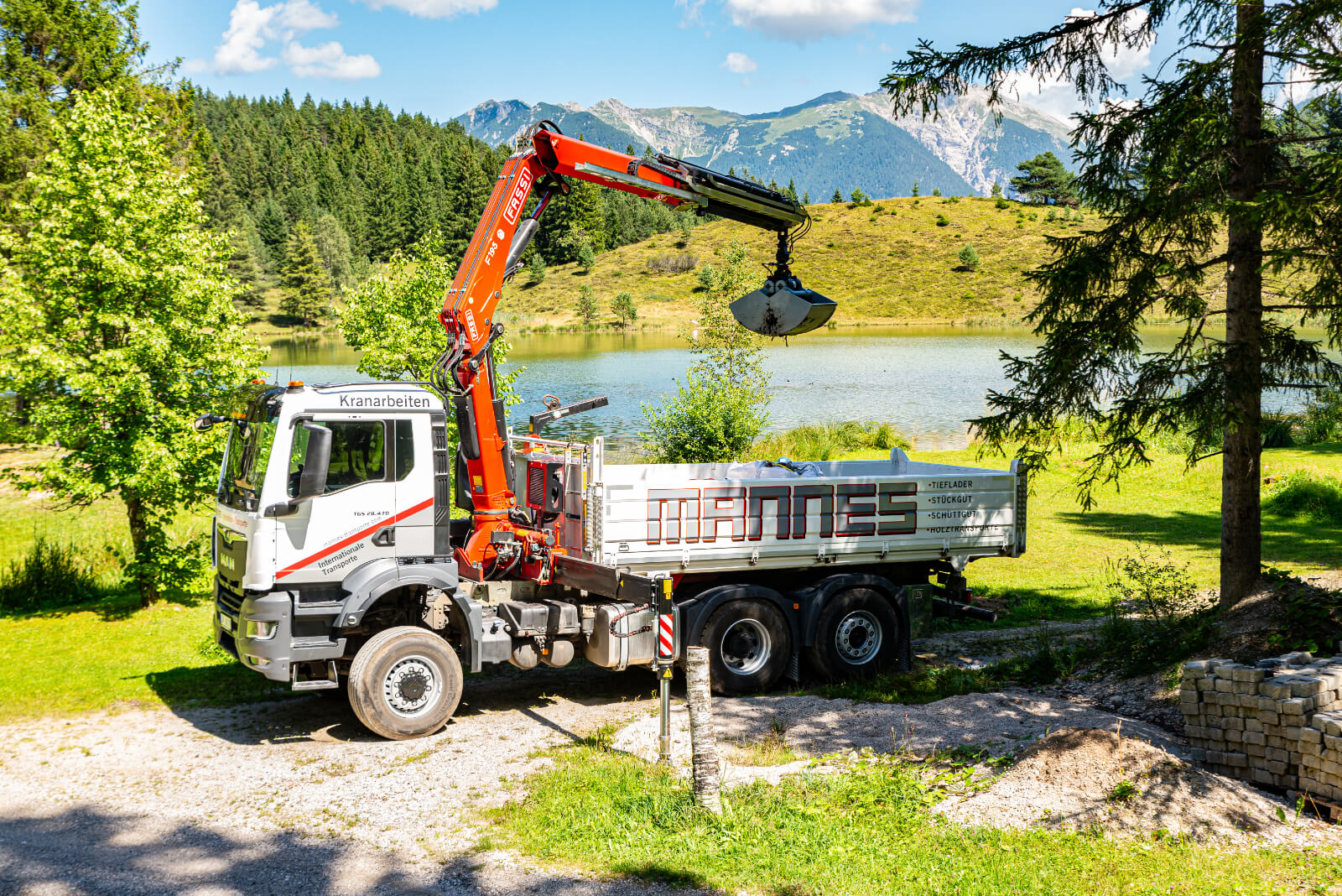 „Die Kombination aus starkem Kran mit geringem Eigengewicht und dadurch hohe Nutzlast ist natürlich ideal und perfekt für unsere vielfältigen Anwendungen,“ erzählt der Unternehmer weiter. „Wir setzen den Kran sowohl im Zweischaleneinsatz für Erdbewegungen oder in Verbindung mit dem Holzgreifer für unsere Tonholztransporte ein“, so Mannes begeistert. „Natürlich ist der Kran ebenfalls für Baumaterial im Paletten- oder klassischen Hakeneinsatz geeignet,“ ergänzt er.
